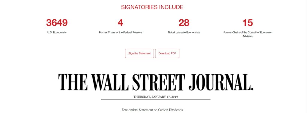 A steadily rising carbon tax and dividend was the way forward favoured by over 3,600 US economists, including 28 Nobel laureates in a letter published on 17/1/2019. The group has stated that “a carbon tax offers the most cost-effective lever to reduce carbon emissions at the scale and speed that is necessary”, continuing “all revenues should be returned directly to citizens… to maximize fairness and political viability”. This is the largest public statement of economists in history.
