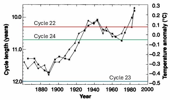 The plot below is the key one from the 1991 paper. It shows two curves. The one using + is the sunspot cycle length whilst the curve with * is the temperature anomaly (i.e. difference from the 1951-1980 average).