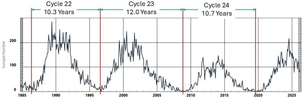 The graph below is taken from NOAA and shows the level of sunspot activity from late 1984 until early 2026.